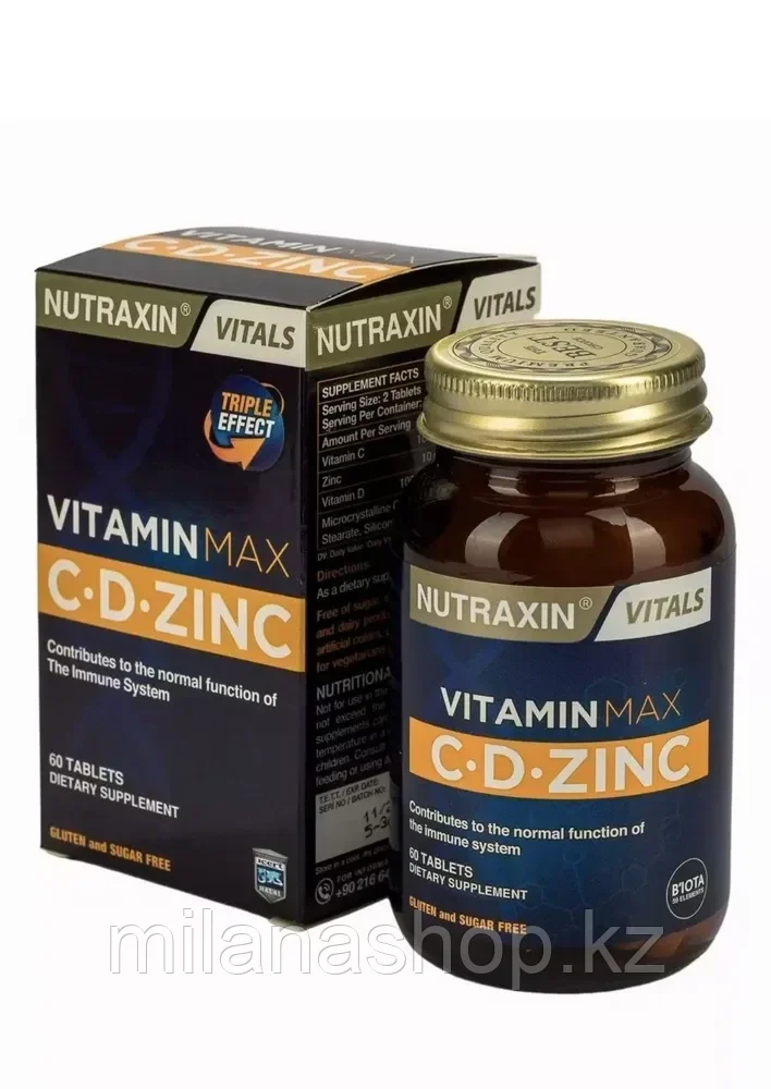 УКРЕПЛЕНИЕ ИММУНИТЕТА И СКОРАЯ ПОМОЩЬ В СЕЗОН ПРОСТУД. Прямая поставка из Турции. Витамин Макс нутраксин содержит витамины С, витамины Д и цинк, а также три мощных компонента. Содержит 1000 мг витамина С,1000 МЕ витамина Д и 10 мг цинка. Витамин C + D3 и цинк Nutraxin — это комплекс 3 важных элементов для защиты организма и улучшения иммунной системы.Витамин C: самый известный и мощный антиоксидант. Способствует иммунной защите. Участвует во многих процессах, например как усвоении коллагена и обладает сильным противовирусным действием.Витамин D: играет решающую роль в активации иммунной защиты. Способствует усвоению кальция. Соответственно помогает поддерживать прочность костей и когнитивную функцию.Цинк: необходим для правильного функционирования иммунной системы, включая развитие иммунных клеток и клеточную коммуникацию. Уменьшает окислительный стресс и воспалительные реакции.Nutraxin Vitamin Max усиливает как местный иммунитет, защищая организм от вторжения антигенов извне, так и системный иммунитет, что приводит к уничтожению уже проникшего внутрь организма чужеродного генетического материала. Витамины С, Д и цинк имеют иммуноукрепляющее действие, поддерживают здоровую иммунную систему благодаря своей способности сохранять и модулировать некоторые факторы иммунной функции: активность макрофагов и иммуноглобулинов. Витамин С нейтрализует свободные радикалы, которые разрушают клетки и ускоряют процесс их старения, в результате чего уменьшается оксидативный стресс. Во время простуды уровень витамина С может резко упасть, так как большая его часть используется для активизации иммунных ответов. Поэтому во время простудных заболеваний и для их профилактики рекомендуют применять данное органическое вещество. Кроме того, витамин С укрепляет здоровье костей, мышц и кровеносных сосудов. Витамин Д - это вещество, которое вырабатывается надпочечниками после попадания на кожу ультрафиолетовых лучей. Он повышает двигательную (хемотаксис) и фагоцитарную функцию (захват и поглощение патогенов) иммунных клеток, что приводит к быстрой реакции на чужеродное тело, например, вирус или бактерию. Nutraxin Vitamin Max является помощником для поддержания иммунной системы при многих заболеваниях и патологических состояниях организма.Диетическая добавка "Комплекс витаминов C, D и цинк" от NUTRAXIN содержит наиболее эффективные компоненты для укрепления и поддержки нормального функционирования иммунной системы и метаболических процессов. Витамины C, D и микроэлемент цинк обеспечивают максимальную защиту организма от простуд и вирусов, поддерживают иммунитет во время периода простудных заболеваний, повышают способность организма сопротивляться инфекциям и ускоряют выздоровление. Сбалансированная формула продукта не содержит искусственных консервантов, красителей, подсластителей и таких аллергенов, как сахар, соль, крахмал, дрожжи, глютен, соя, пшеница и молокопродукты. Подходит для вегетарианцев и веганов.Нормализует работу иммунной системы.Нормализует свертываемость крови.Способствует росту и развитию костной ткани Нейтрализует свободные радикалы.Рекомендации по применению:Принимать по 1-2 таблетке, запивая большим количеством воды. Подходит для веганов.