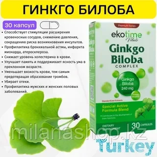 Добавка на основе натурального гинкго билоба в капсулах от турецкого бренда ekotime. Гинкго билоба помогает улучшить кровообращение в мозге, за счёт чего действует как антиоксидант и стимулятор когнитивных функций. Такую добавку часто прописывают тем, кто находится в стрессе, занят активной умственной деятельностью по работе или учёбе, для улучшения памяти и внимания, концентрации и усидчивости. Добавка также помогает справиться со слабостью, стрессом, усталостью, эмоциональным напряжением, она помогает улучшить настроение и общее самочувствие. Её также применяют для укрепления сосудов, при головных болях, для профилактики варикоза, инсультов и тромбоза. Дозировка: 240 мг. 30 капсул на курс в один месяц (30 дней). В капсулах не содержится аллергенов, сахара и глютена. Способ применения: в качестве биологически активной диетической добавки принимать по одной капсуле в день во время любого из приёмов пищи.