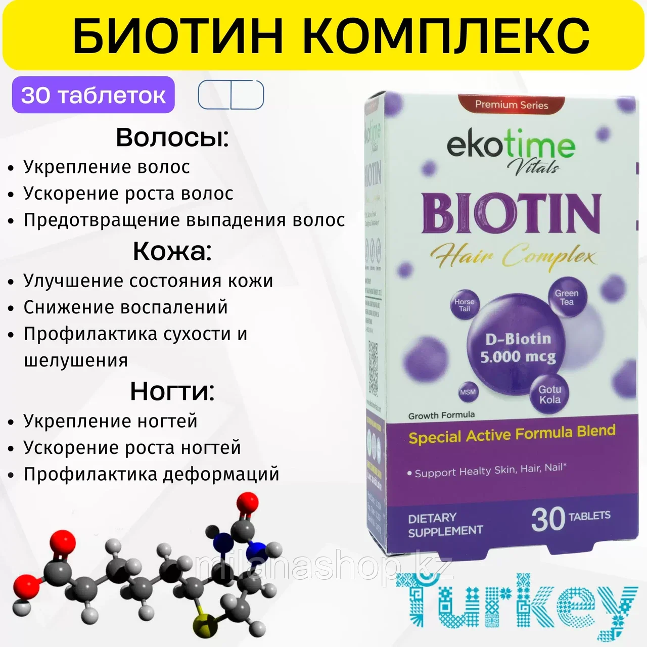 Ваши волосы заслуживают самого лучшего! Ekotime Biotin Hair Complex — это инновационный комплекс, разработанный для поддержки здоровья волос, кожи и ногтей. Он сочетает в себе уникальные натуральные компоненты, такие как биотин, MSM, экстракты зеленого чая, готу колы и хвоща полевого, чтобы ваши волосы были крепкими, блестящими и здоровыми.